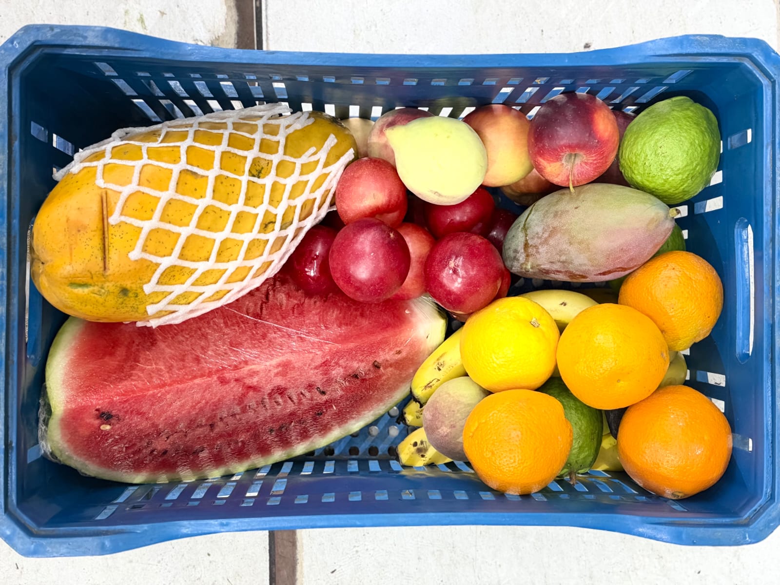 O box conta com banana, maçã gala, pêssego graúdo, ameixa, laranja importada, mamão Formosa, goiaba, manga Tommy e melancia, oferecendo variedade para lanches, sucos e sobremesas ao longo da semana.